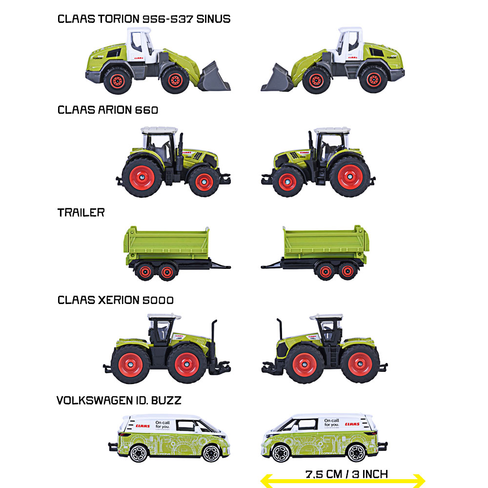 - Lizenzierte Claas Flotte - Das Geschenkset enthält: 1. Claas Arion 660 Traktor, 2. Claas Xerion 5000 Traktor, 3. Claas Torion 956-537 Sinus Radlader, 4. Volkswagen ID. Buzz und 5. Farm-Anhänger.