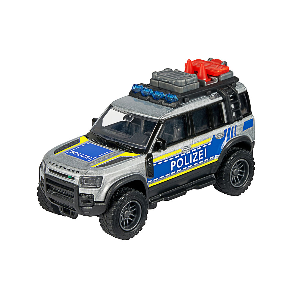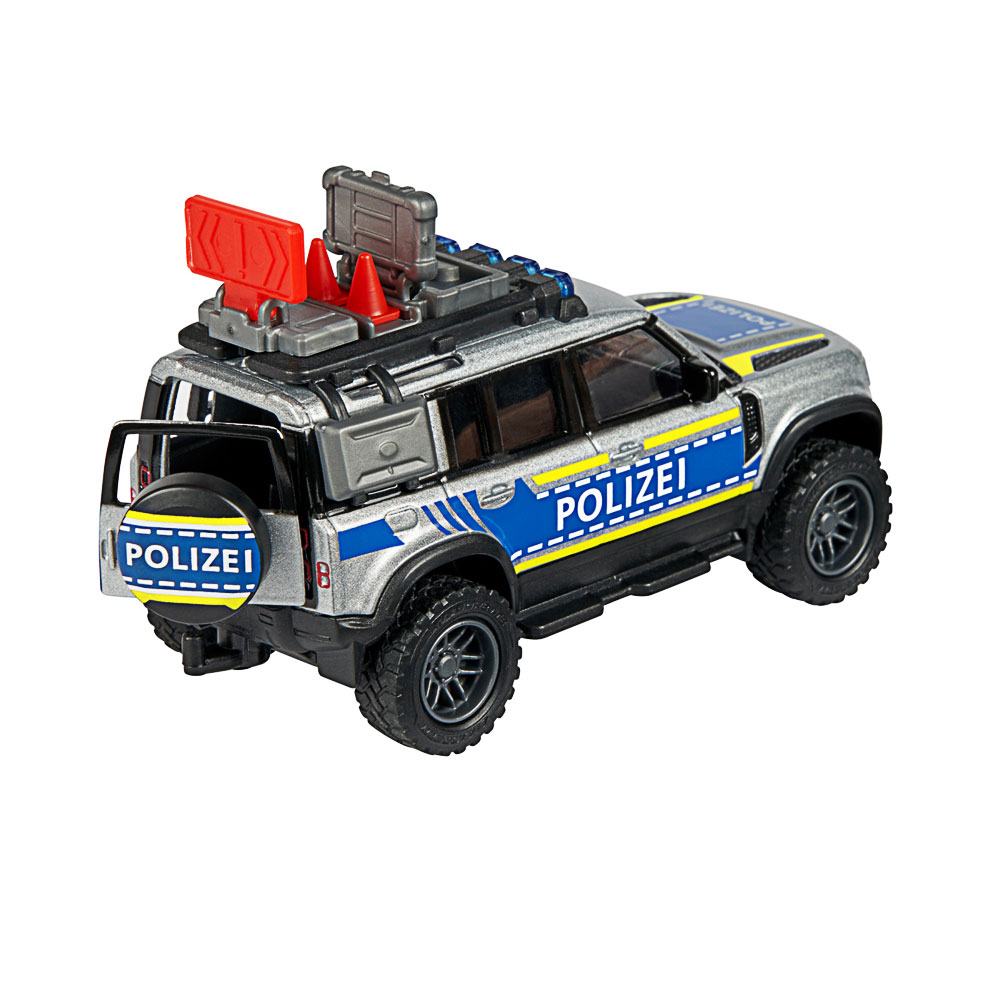 - Polizeiwagen mit Extras - Tatkräftige Unterstützung ist unterwegs: Das 12,5 cm lange Defender 90 Polizei-Auto kommt mit Freilauf, Metall-Kabine und offiziell lizenziertem Land Rover Design angerollt.