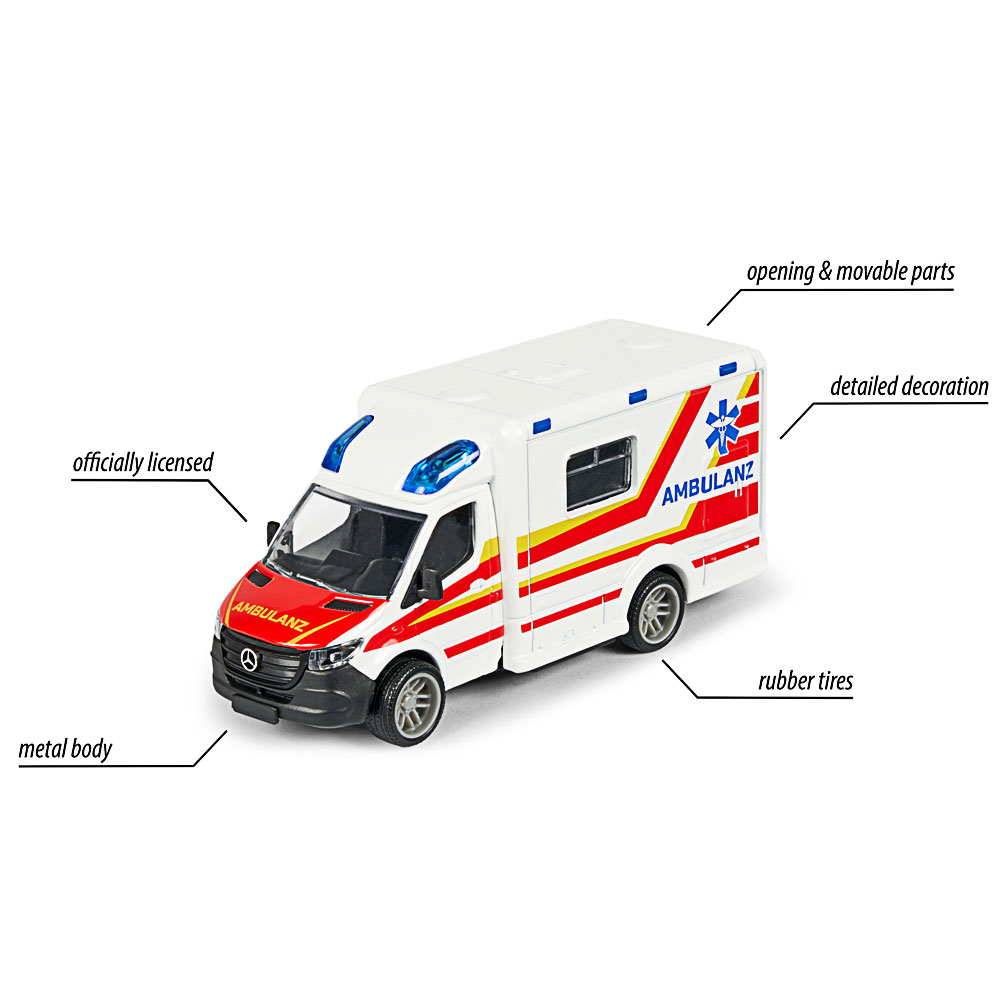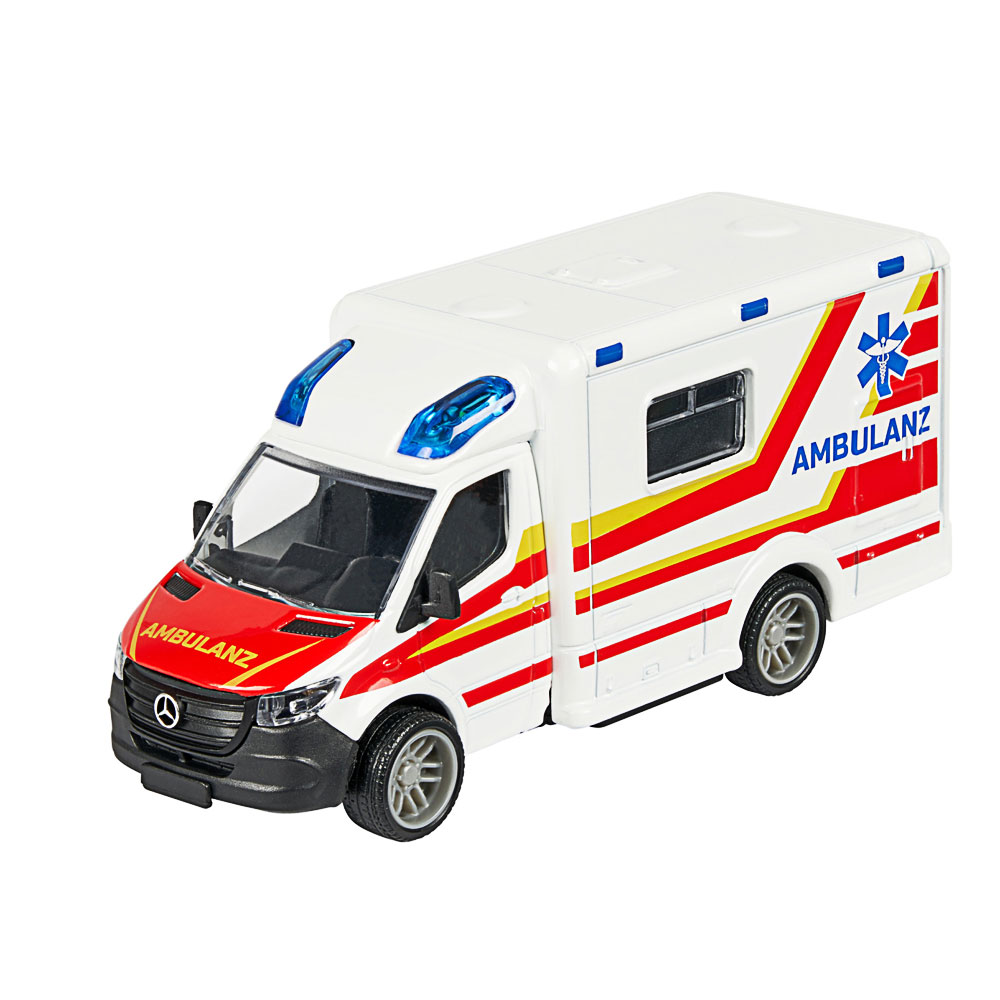 Majorette Auto Mercedes-Benz Sprinter Ambulance (15 cm) - großer Krankenwagen mit Metall-Kabine, Freilauf & Funktionen, Spielzeug-Rettungswagen für Kinder ab 3 Jahre