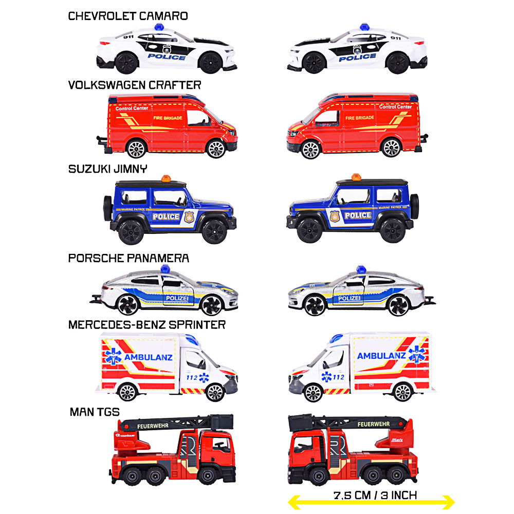 - Bereit für jede Mission - Ob Polizeiauto, Feuerwehr oder Krankenwagen: Die ca. 7,5 cm langen Spielautos mit Freilauf, Metall-Karosserie und z.T. beweglichen Elementen sind allzeit einsatzbereit.
