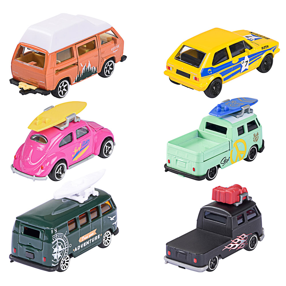 Majorette Volkswagen Premium-Auto: Überraschung mit Style! Mit ihren kultigen Designs, liebevollen Retro-Details und ausgefallenen Looks fallen diese Volkswagen Modelle sofort ins Auge. Vom abenteuerlustigen Volkswagen Camping-Bulli bis zum pinken Volkswagen Beetle mit Surfbrett auf dem Dach: Hier erzählt jedes Automodell seine eigene Story!
