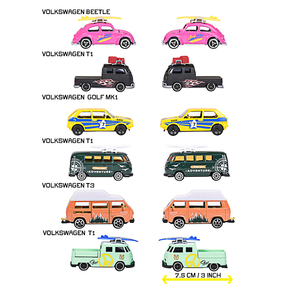 Kultig. Knallig. Komplett liebenswert. Jedes der 6 Spielzeug-Autos ist eine offiziell lizenzierte Volkswagen Nachbildung aus robustem Metall - mit individueller Persönlichkeit! Freilauf und Federung sorgen für reibungslose Roadtrips, während bewegliche Elemente und abnehmbares Zubehör wie Surfbrett oder Dachgepäck zu fantasievollen Fahr- und Spiel-Abenteuern einladen. So sind die kleinen Mini-Flitzer nicht nur charakterstarke Hingucker für die Sammlung, sondern kreative Spielautos mit dem gewissen Etwas im Gepäck.