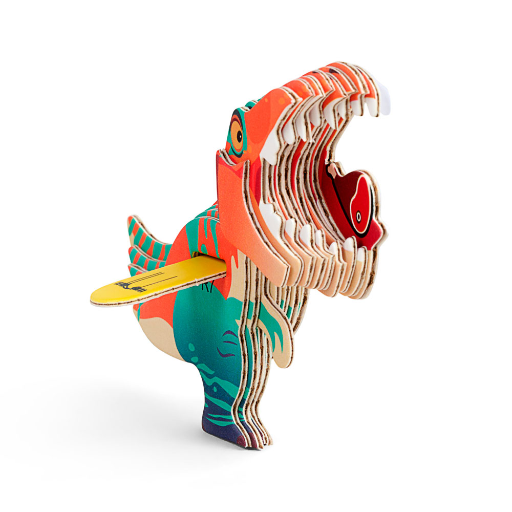 Kreatives Bastelset - Einzelteile aus stabilem Karton werden mit Klebefolie fixiert und ergeben einen imposanten 3D-Tyrannosaurus