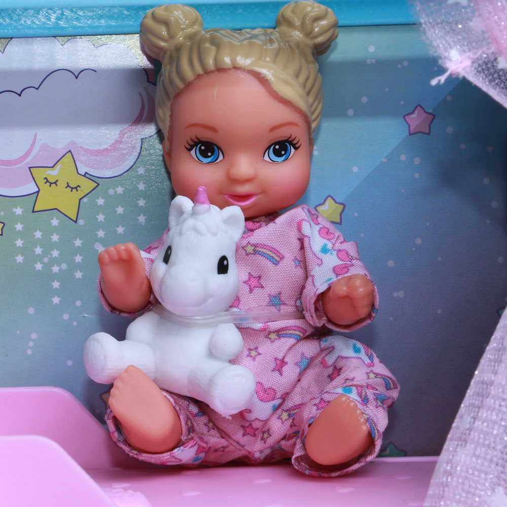 22 Das kleine Baby trägt einen süßen Schlafanzug und sein weißes Einhorn ist auch dabei.
