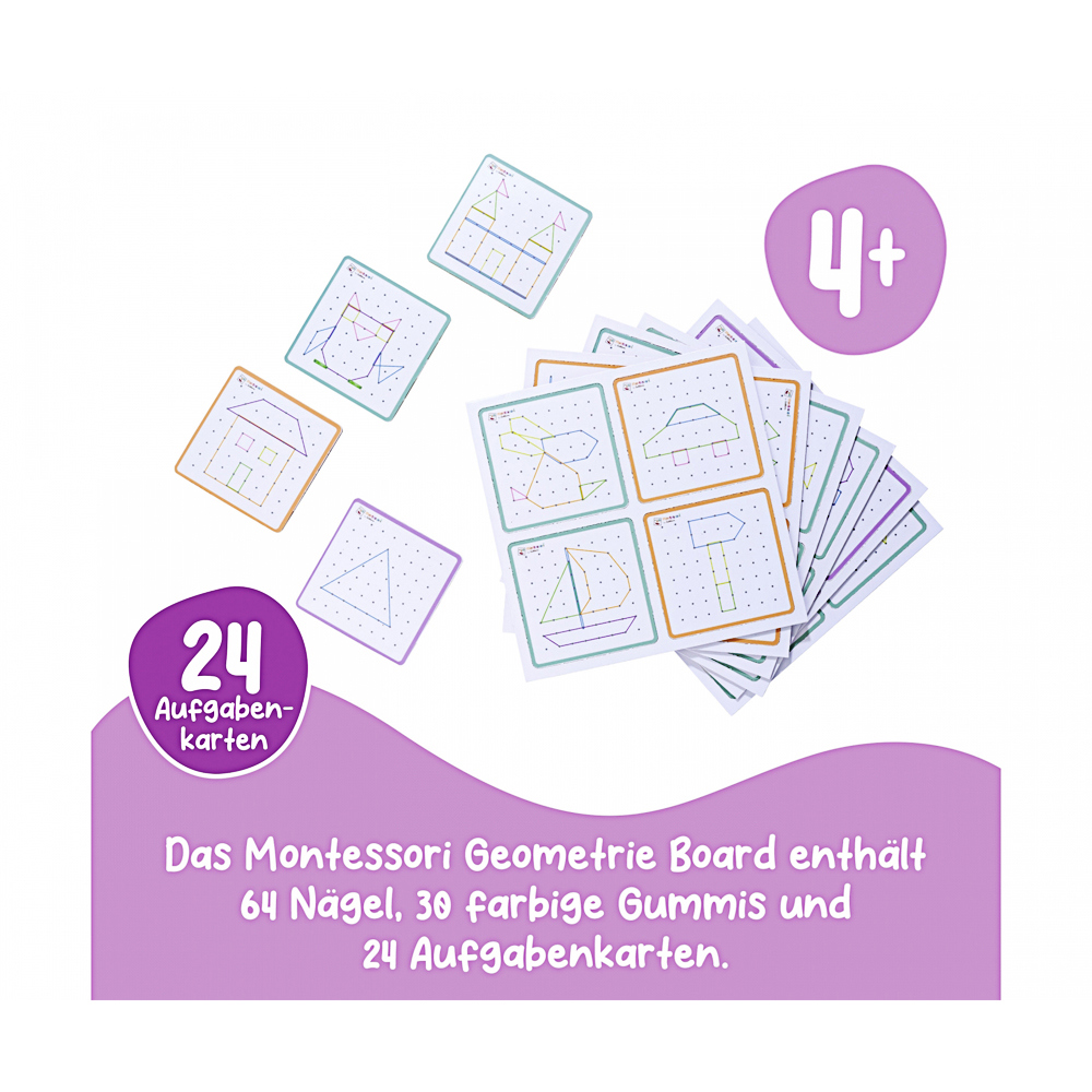 Das Montessori Geometrie Board mit 64 Nägeln und 30 farbigen Gummis ist ein tolles Set zur Förderung der Feinmotorik und Kreativität.