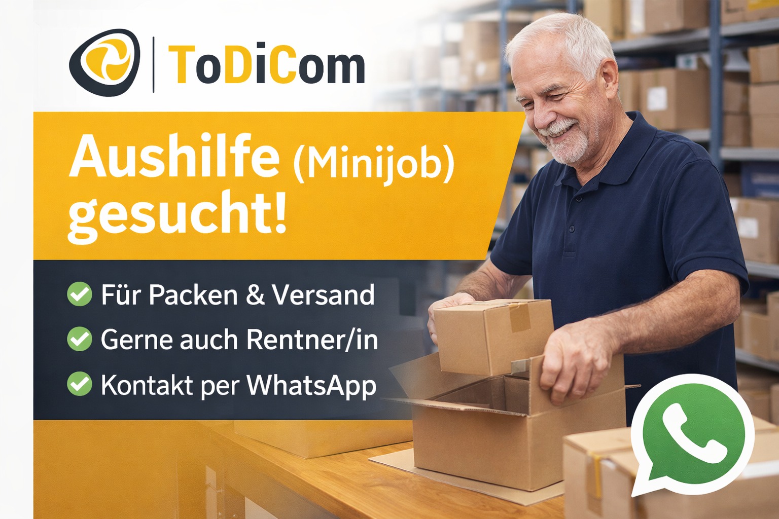 Für unseren Onlineshop - www.todicom.shop suchen wir eine zuverlässige Aushilfe auf Minijob-Basis, die uns beim Packen und Vorbereiten von Bestellungen unterstützt.
