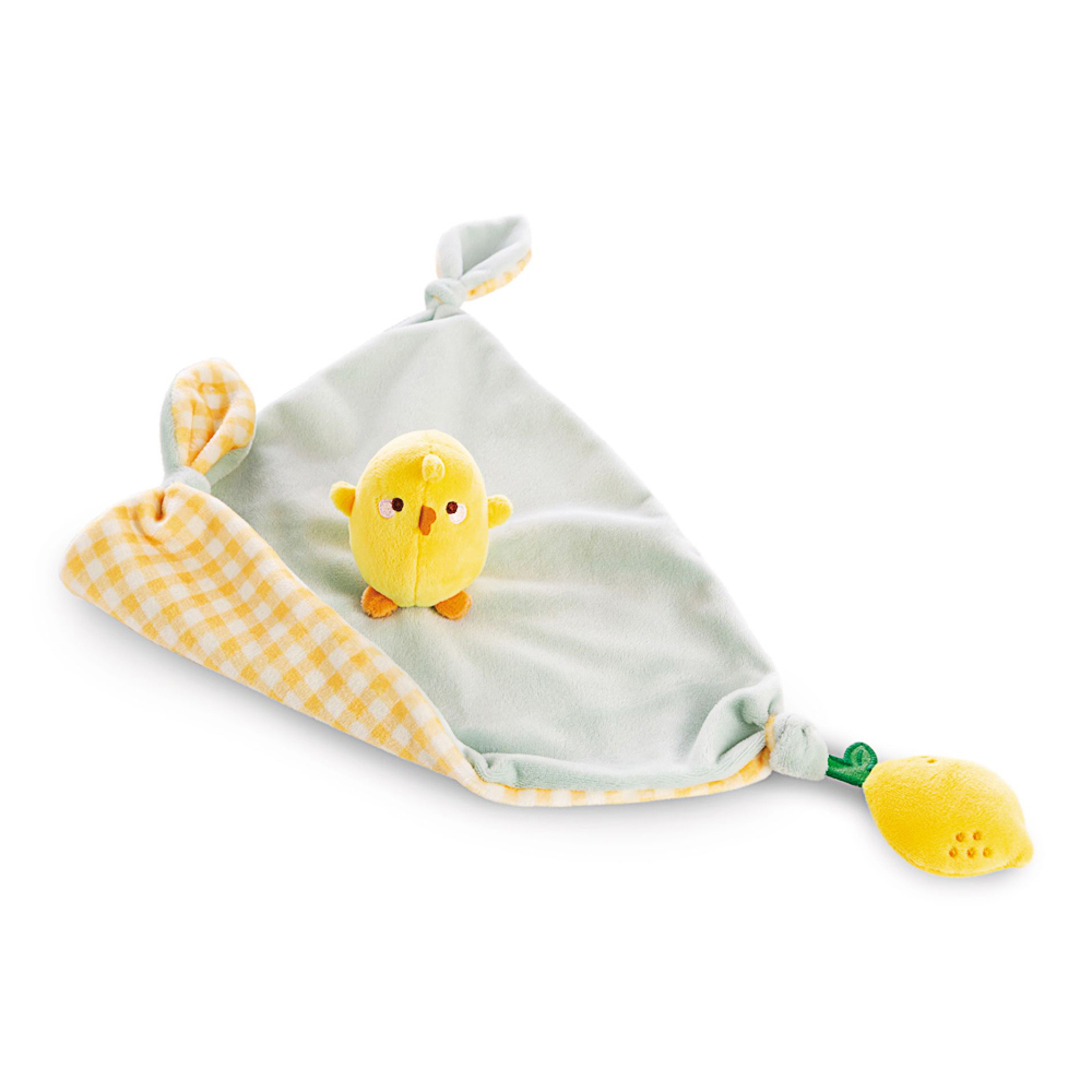 Das entzückende Nuckeltuch findet überall seinen Platz, ob im Bettchen, Kinderwagen oder Autositz. Piu Piu ist als figürliches Kuscheltier auf dem doppelseitig gestalteten Schmusetuch in den Farben Pastellgrün und Gelb befestigt. Die Knoten und eine lustige Plüschzitrone an den Zipfeln des dreieckigen Kuscheltuchs laden das Baby spielerisch zum Greifen und Festhalten ein.