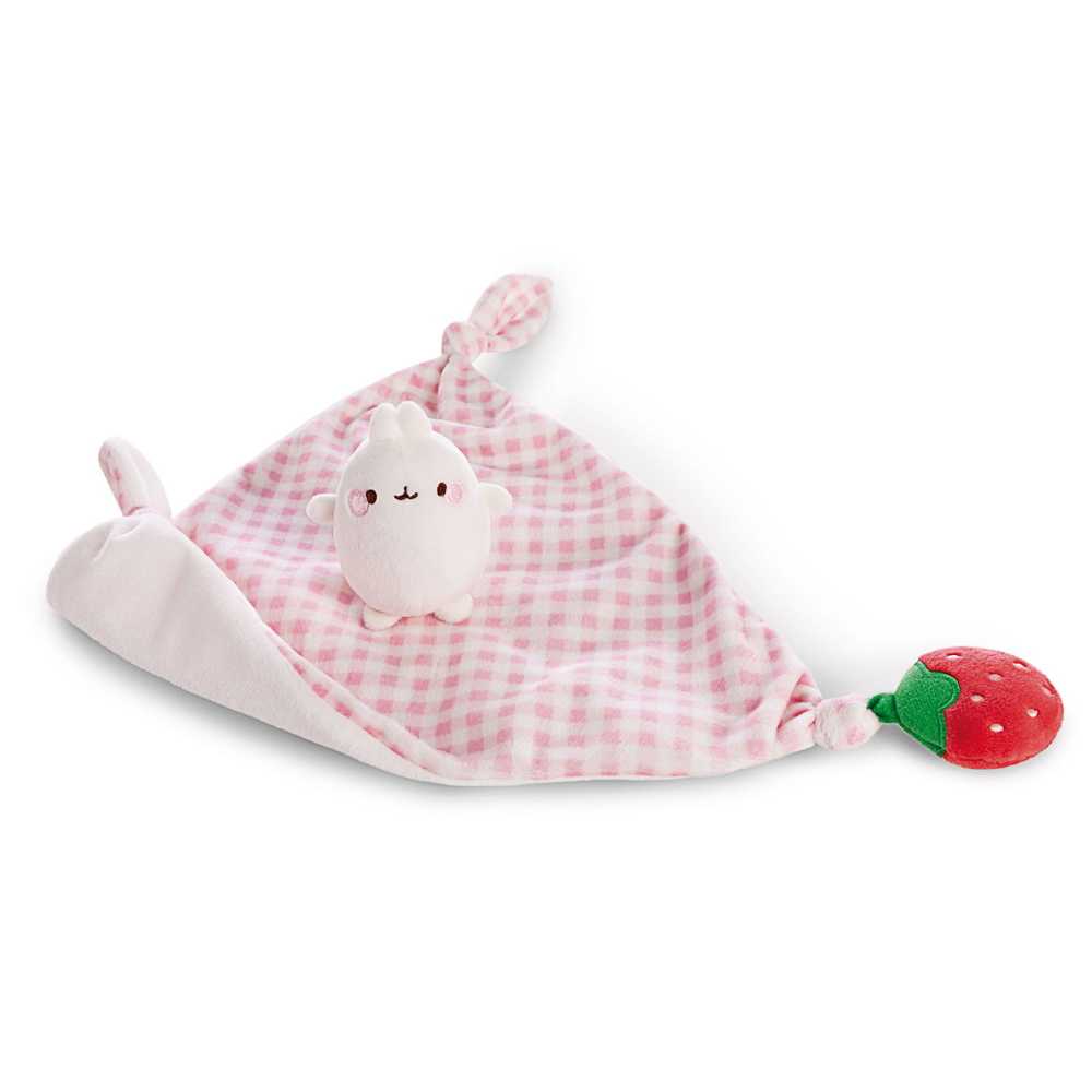 Das entzückende Nuckeltuch findet überall seinen Platz, ob im Bettchen, Kinderwagen oder Autositz. Molang ist als figürliches Kuscheltier auf dem doppelseitig gestalteten Schmusetuch in den Farben Weiß und Rosa befestigt. Die Knoten und eine lustige Plüscherdbeere an den Zipfeln des dreieckigen Kuscheltuchs laden das Baby spielerisch zum Greifen und Festhalten ein.