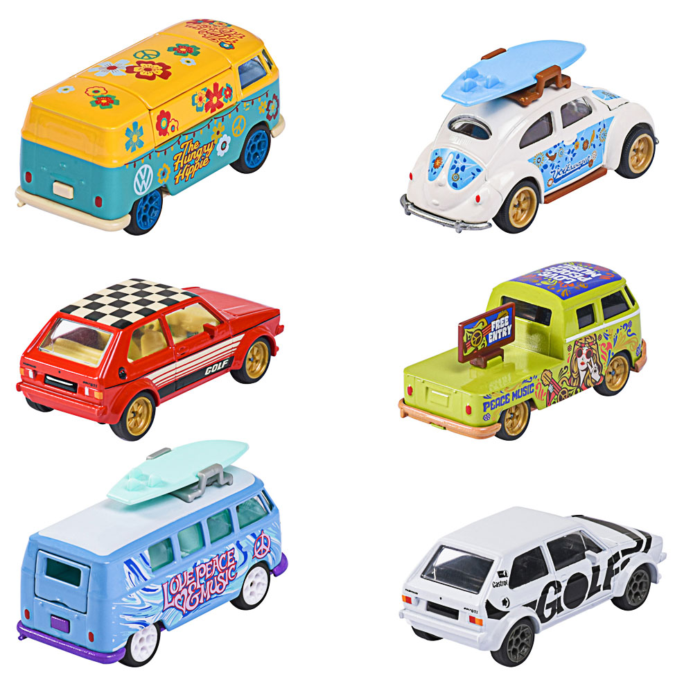 Majorette Deluxe-Autos: Volkswagen Modelle in abgefahrenen Looks! Diese Volkswagen Edition ist nichts für langweilige Garagen: Ob mit knallbunten Hippie-Motiven, Schachbrett-Muster oder abnehmbarem Surfbrett: Jedes der 6 kleinen Spielzeugautos bringt maximalen Style ins Spiel! Vom kultigen Volkswagen Beetle bis zum legendären Volkswagen Bulli: Hier treffen ikonische Automodelle auf mutige Muster - für kreative Kinder und wilde Sammler-Herzen!