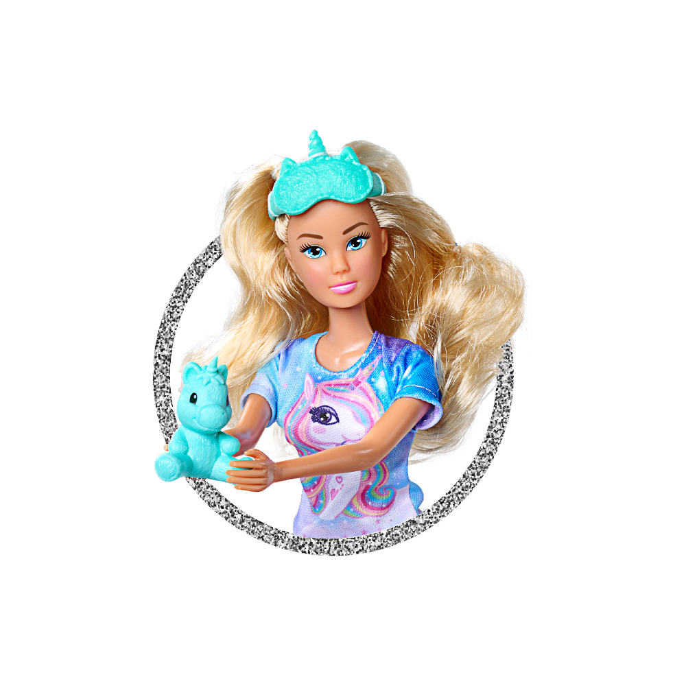 Steffi Love ist bereit für eine gemütliche Pyjama-Party! Die modische Puppe trägt einen süßen, bequemen Schlafanzug mit niedlichen Mustern und passenden Hausschuhen.