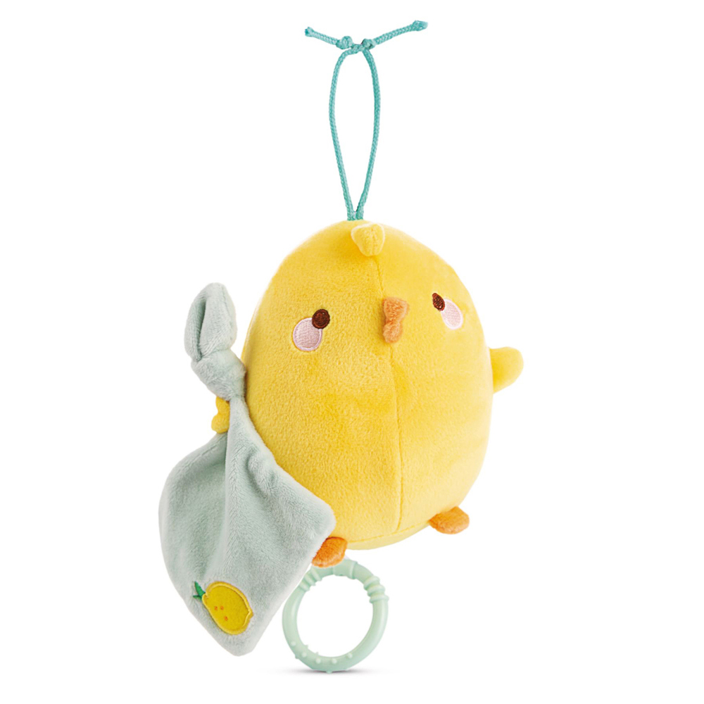 Zieht man an dem kleinen Ring, der mittels einer Schnur am softig weichen Körper des 13cm großen Piu Pius befestigt ist, kommt das integrierte (und herausnehmbare) Spielwerk zum Einsatz und Baby wird mit Schuberts Wiegenlied sanft ins Reich der Träume begleitet. Piu Piu trägt sein pastellgrünes Schmusetuch mit einer gestickten Zitrone und macht das Kinderzimmer zu einem Wohlfühlort. Mit Hilfe von zwei Bändchen lässt sich die Spieluhr ganz einfach am Bettchen, Kinderwagen oder Babyschale befestigen. Die Spieluhr aus der MOLANG Baby Kollektion von NICI ist eine tolle Einschlafhilfe und fördert gleichzeitig motorische und sensorische Fähigkeiten der Allerkleinsten.
